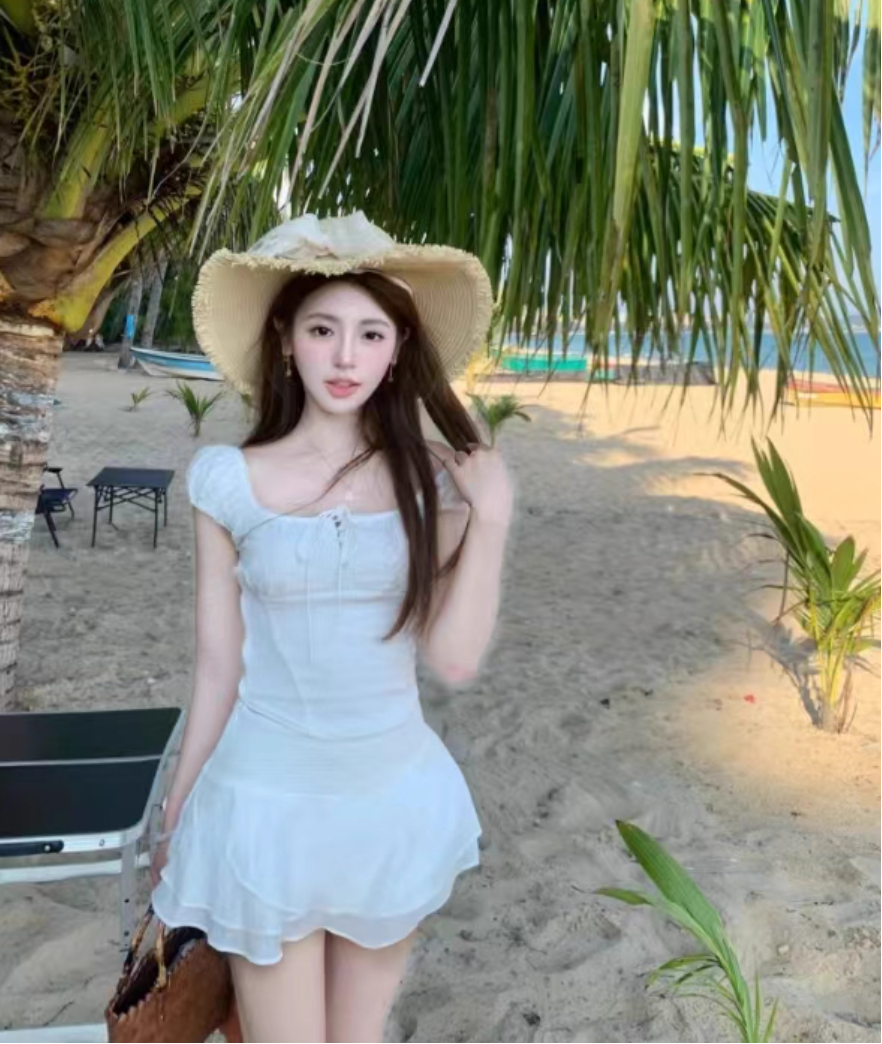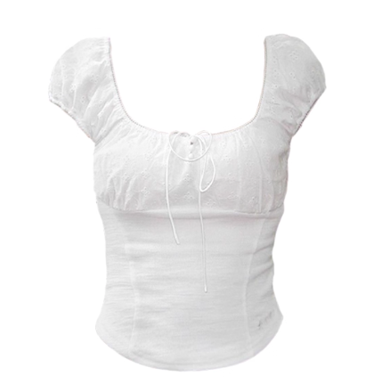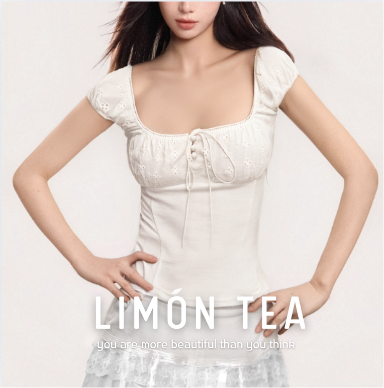 ‘纯欲少女’ 蕾丝方领泡泡袖上衣
