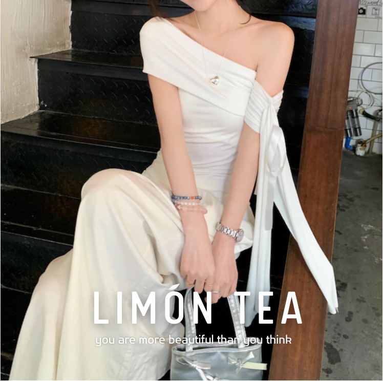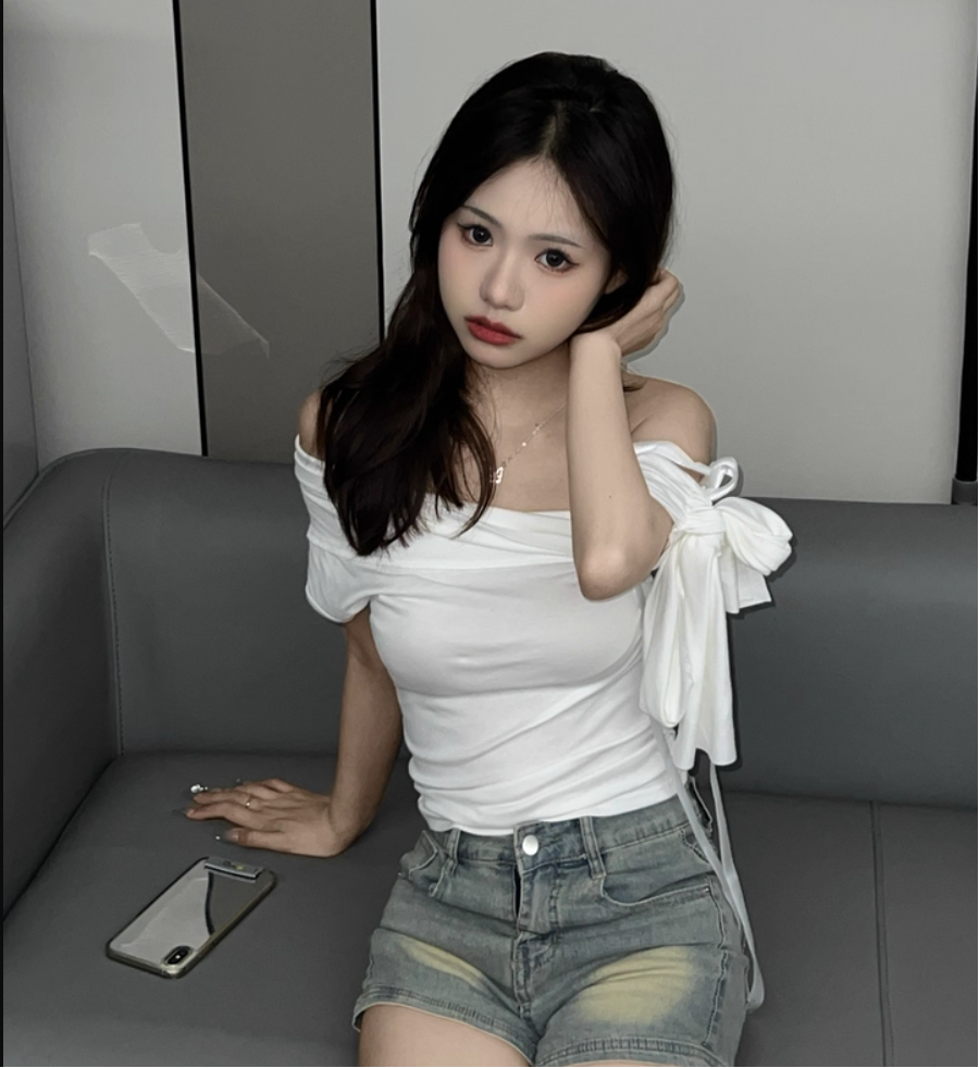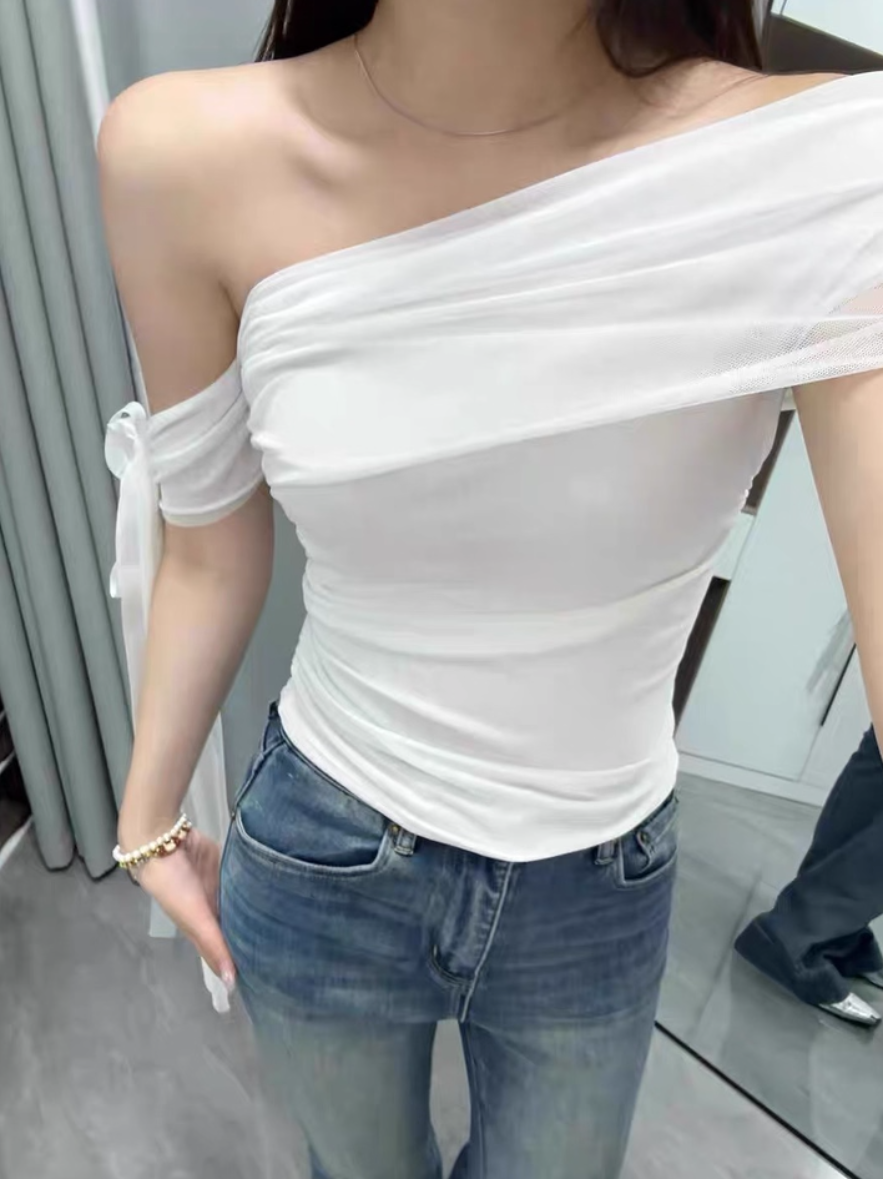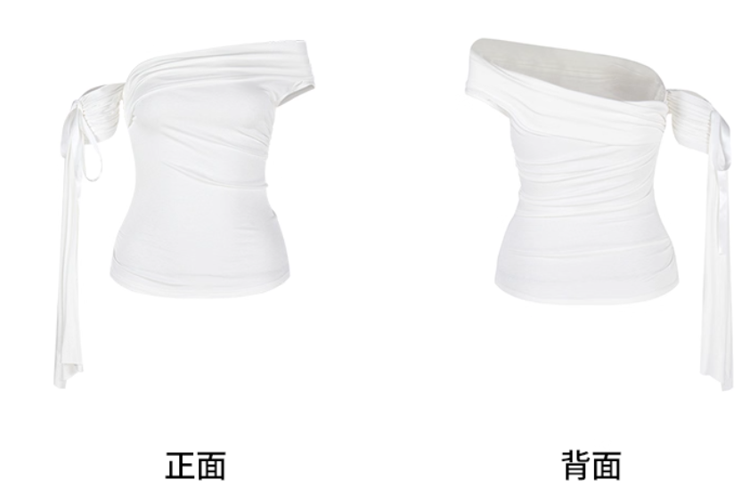 '纯欲chic' 一字肩缎带不规则斜肩T恤