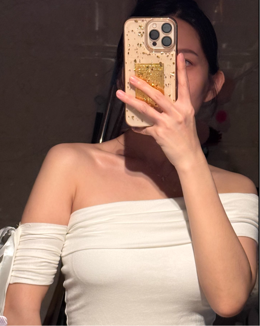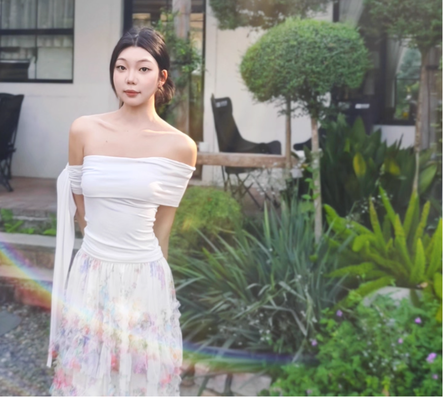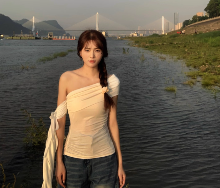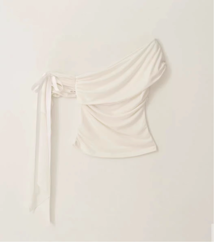 '纯欲chic' 一字肩缎带不规则斜肩T恤