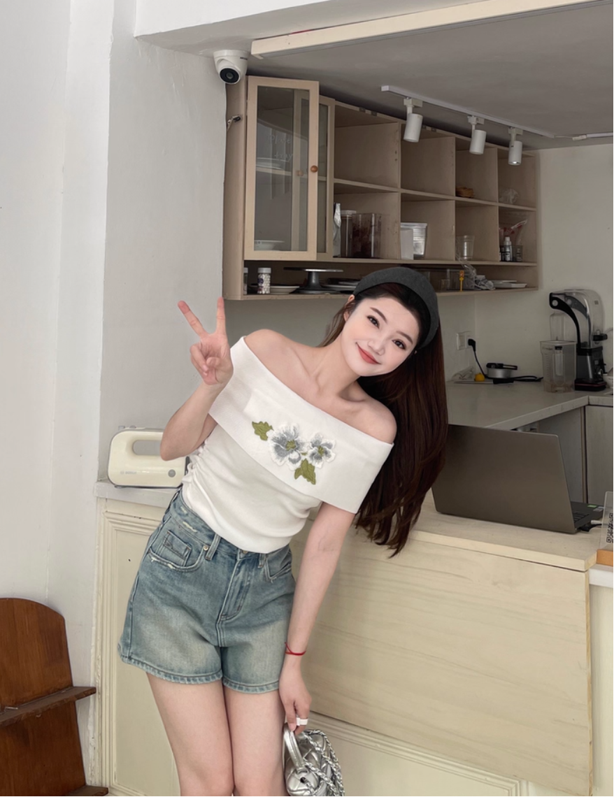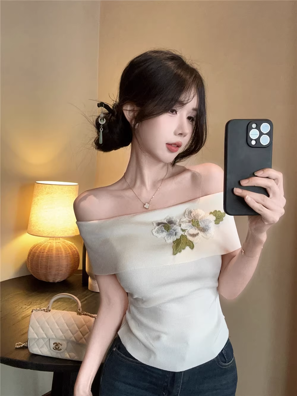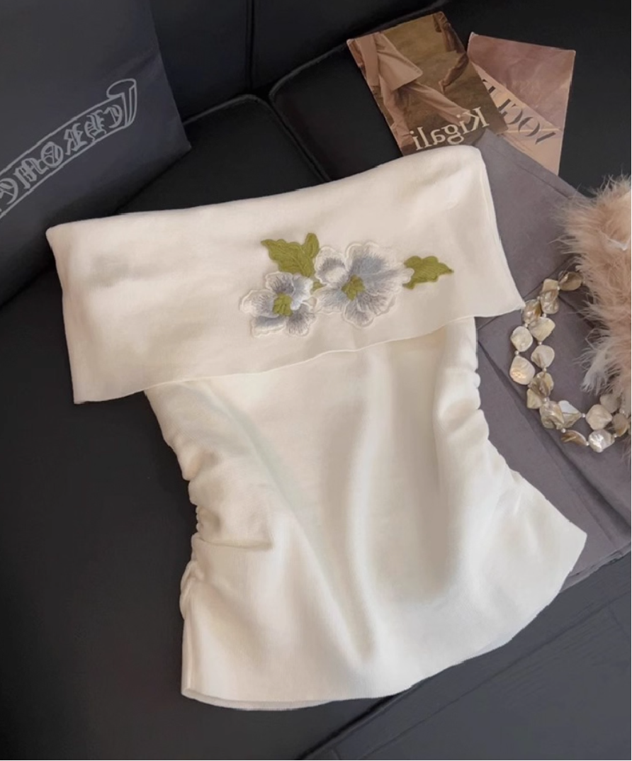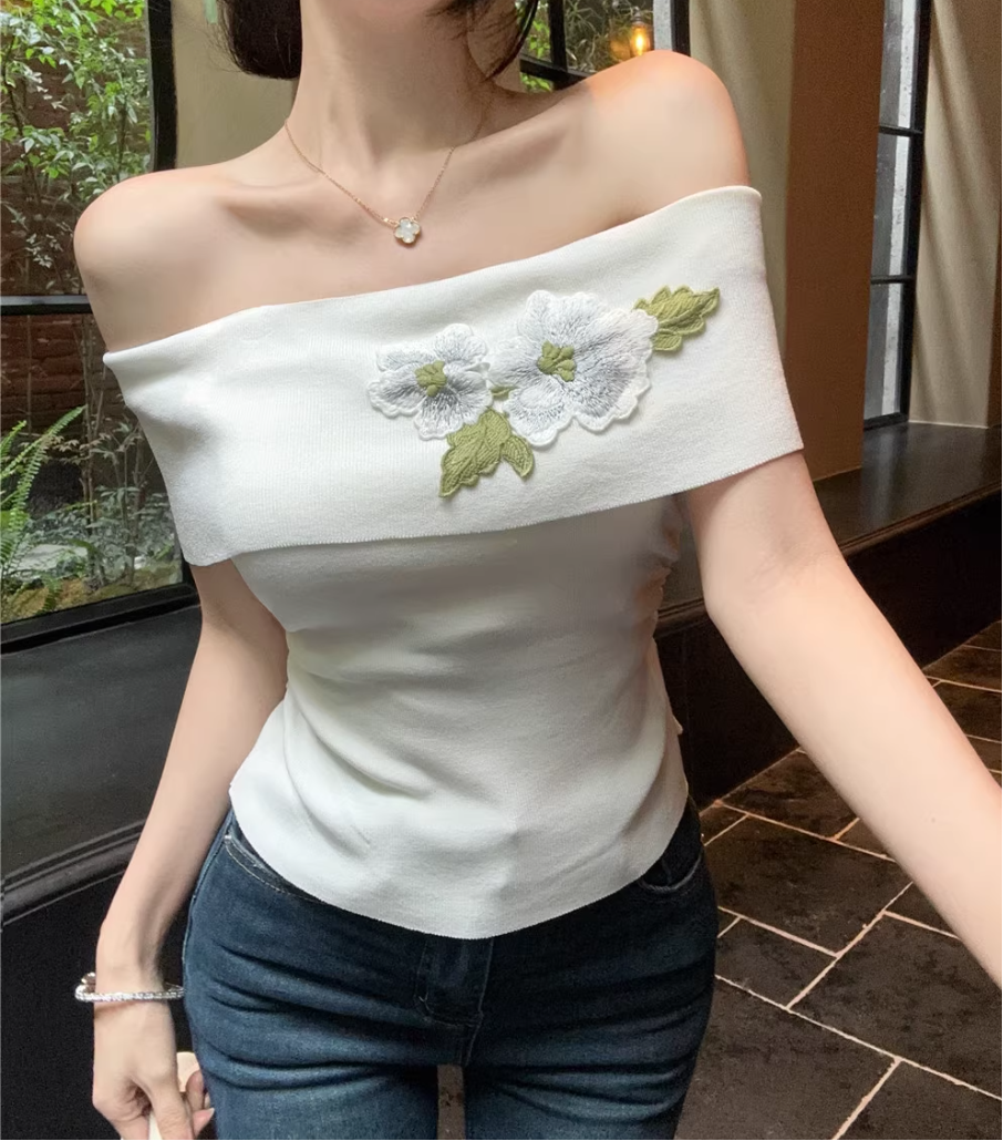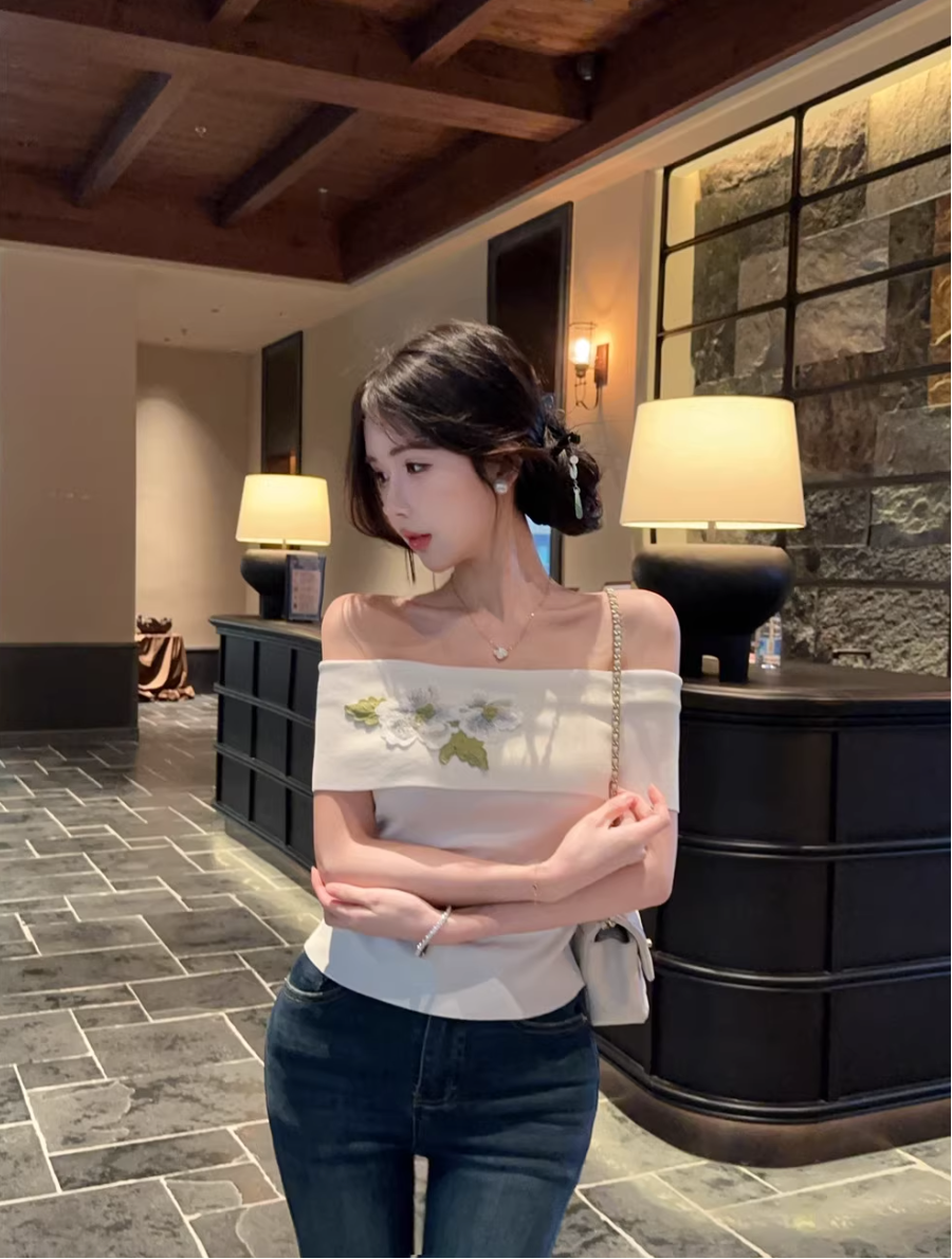 ‘新中式’ 清冷感刺绣花朵收腰一字肩上衣