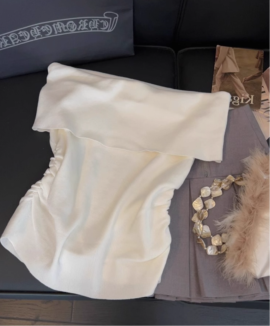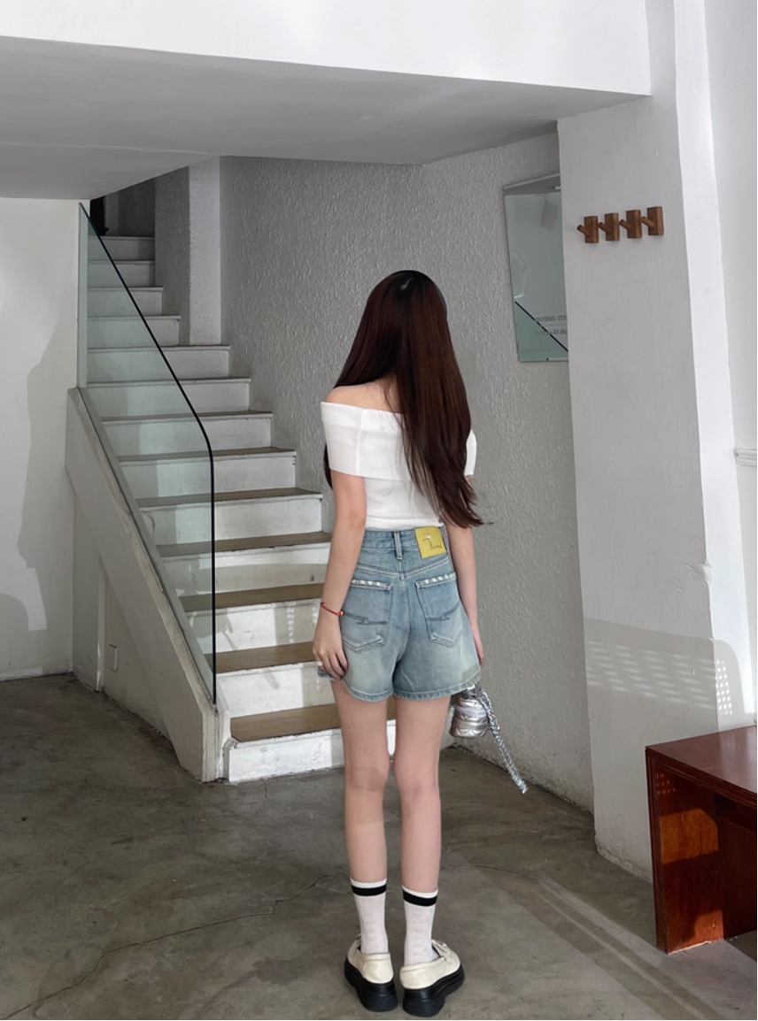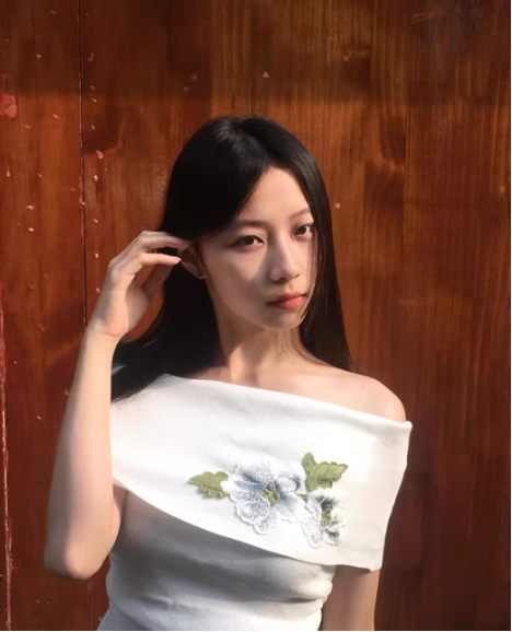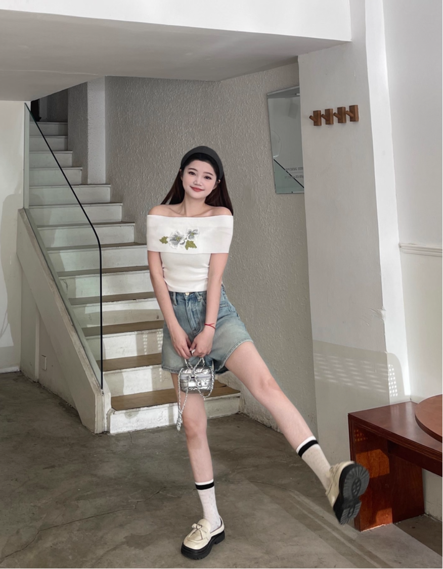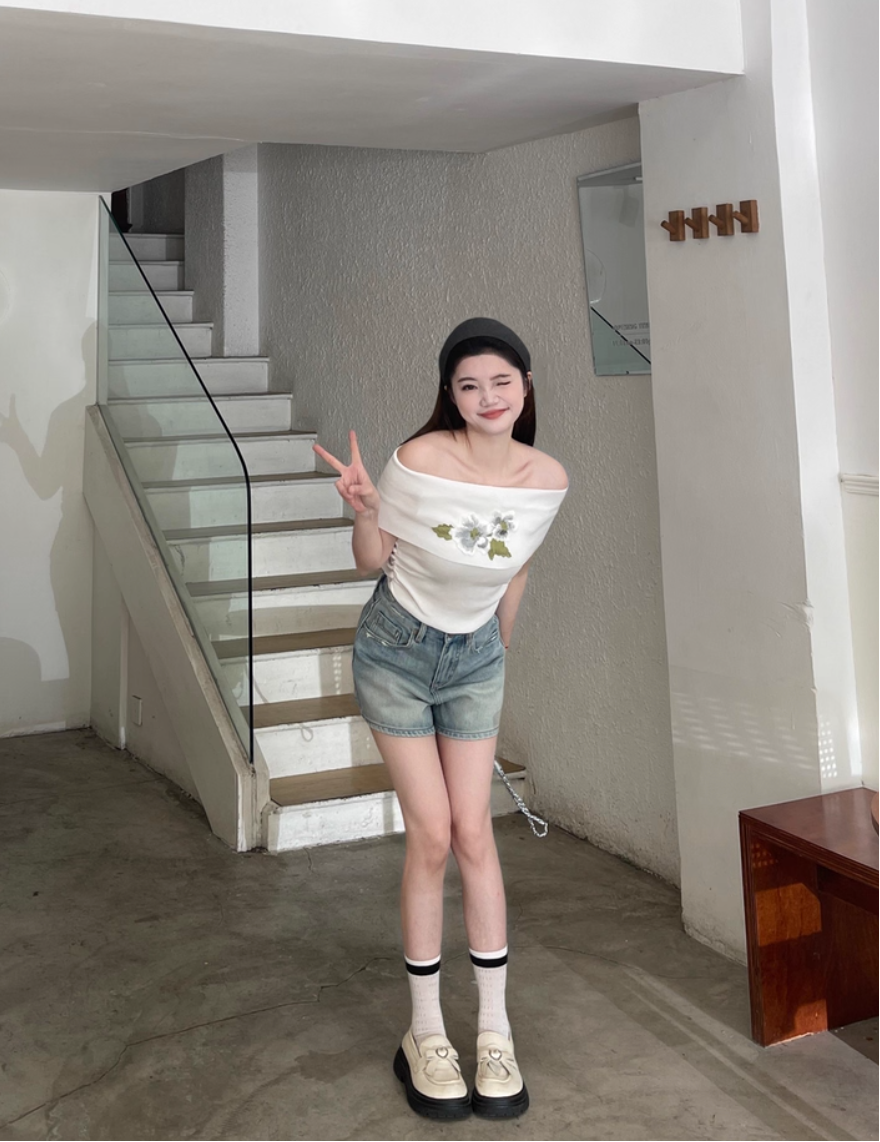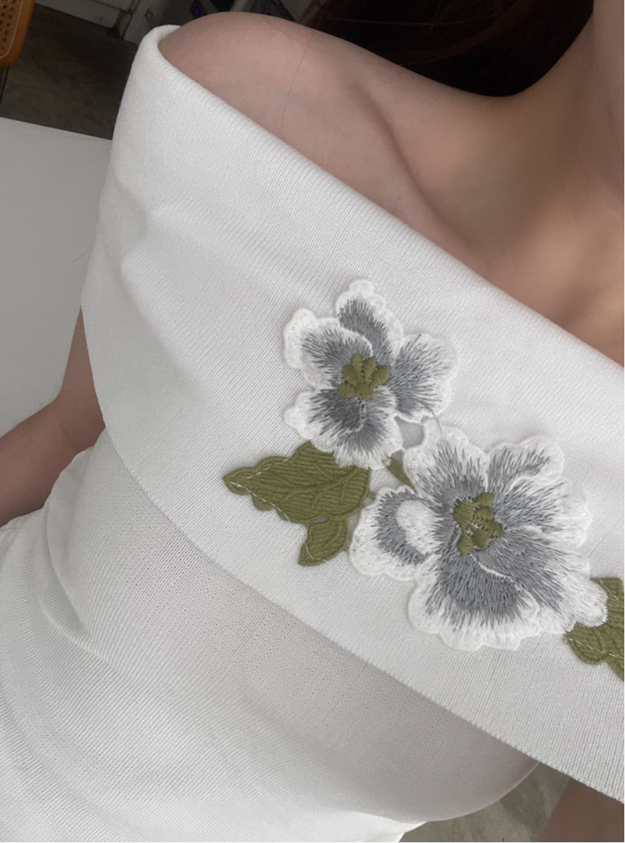 ‘新中式’ 清冷感刺绣花朵收腰一字肩上衣