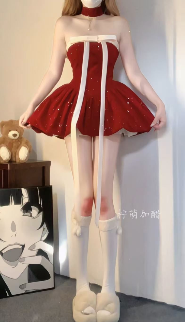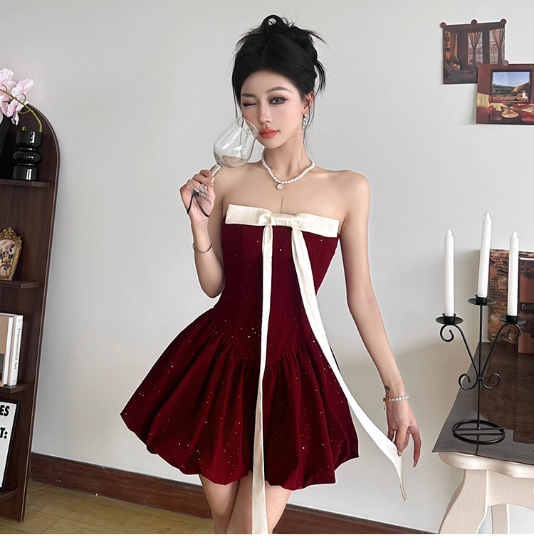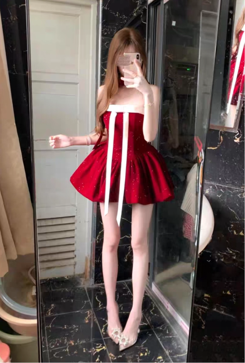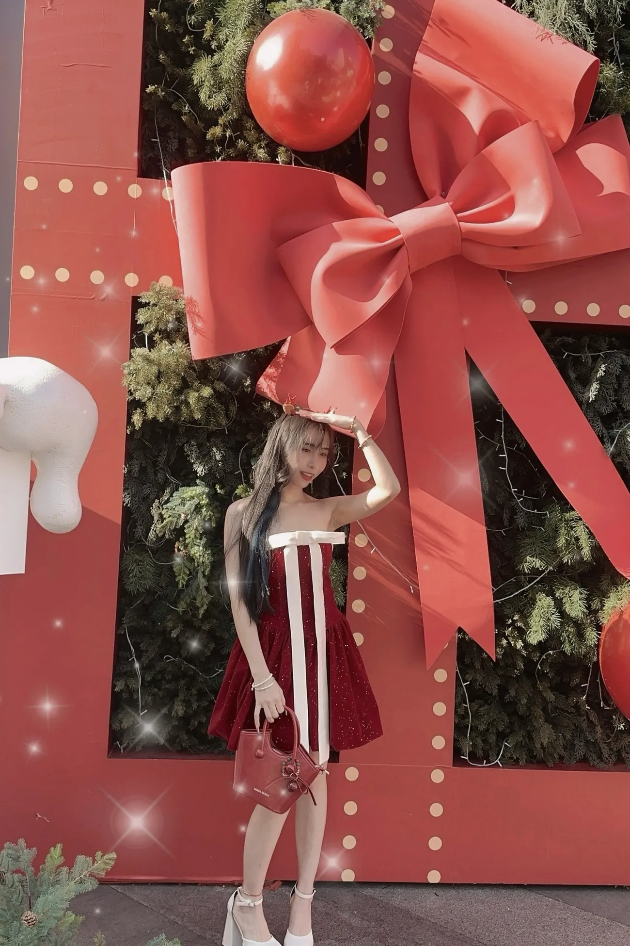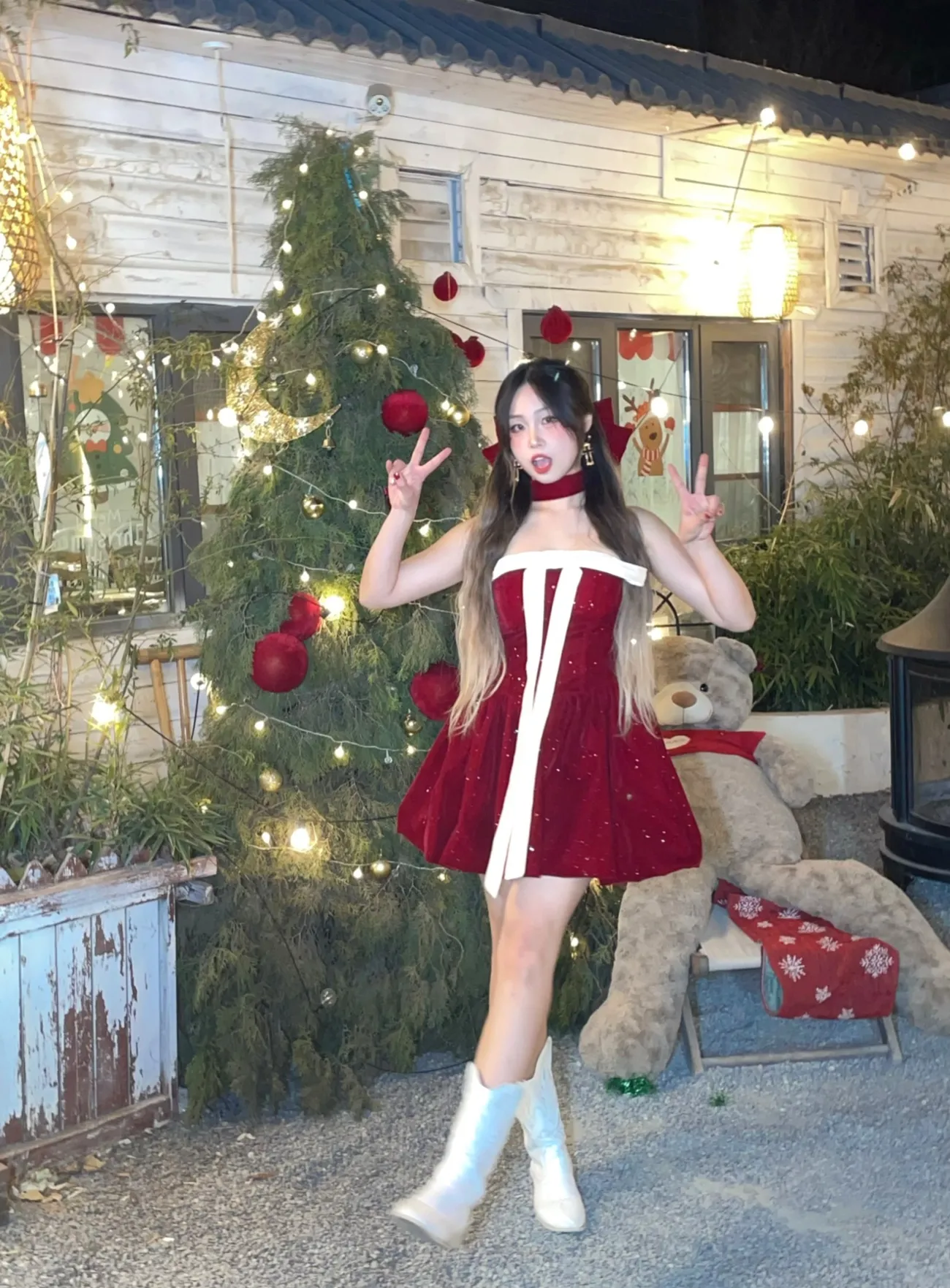 ‘首尔圣诞’ 蝴蝶结红丝绒花苞裙