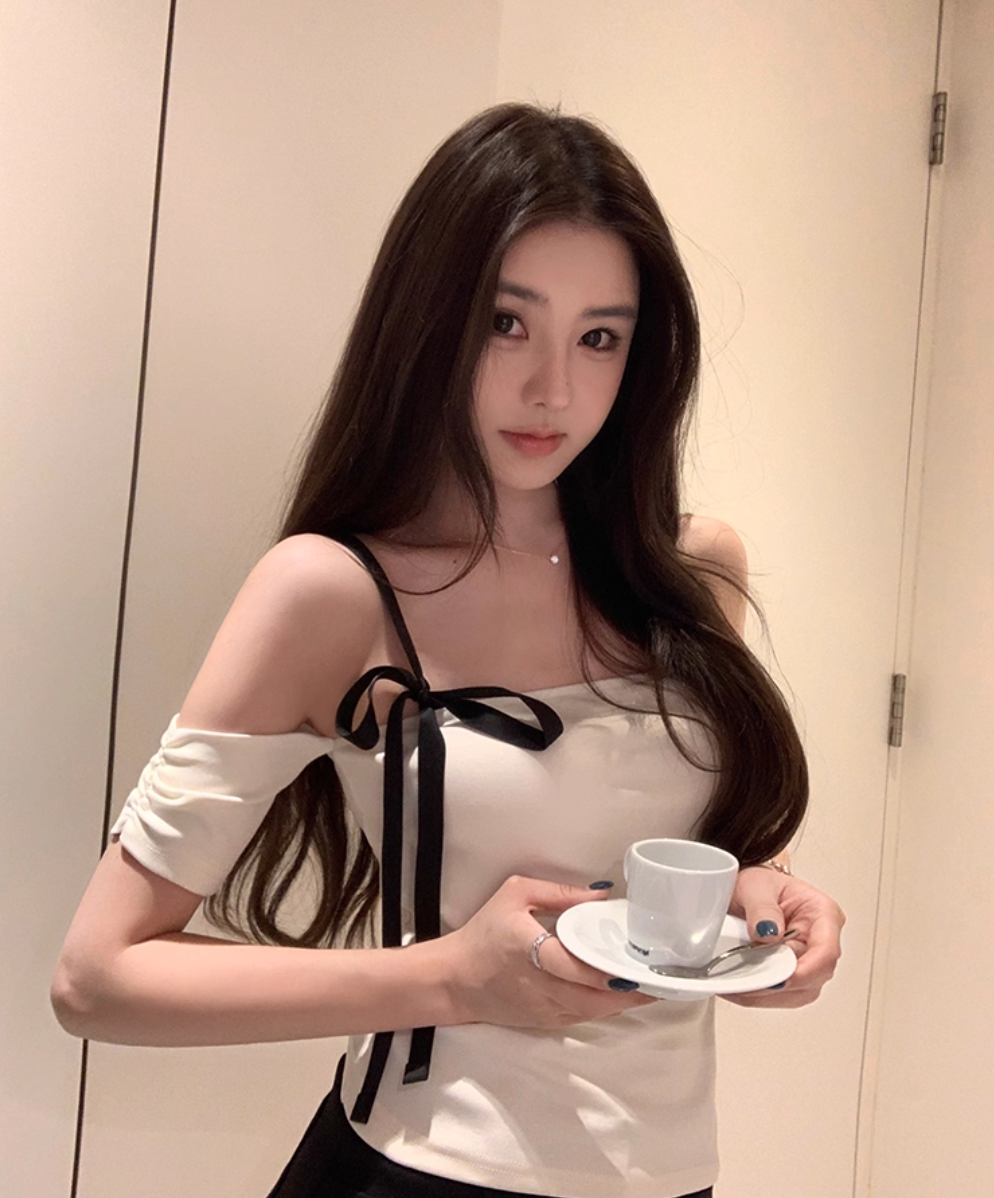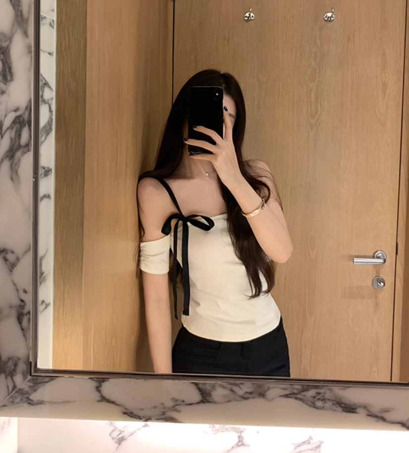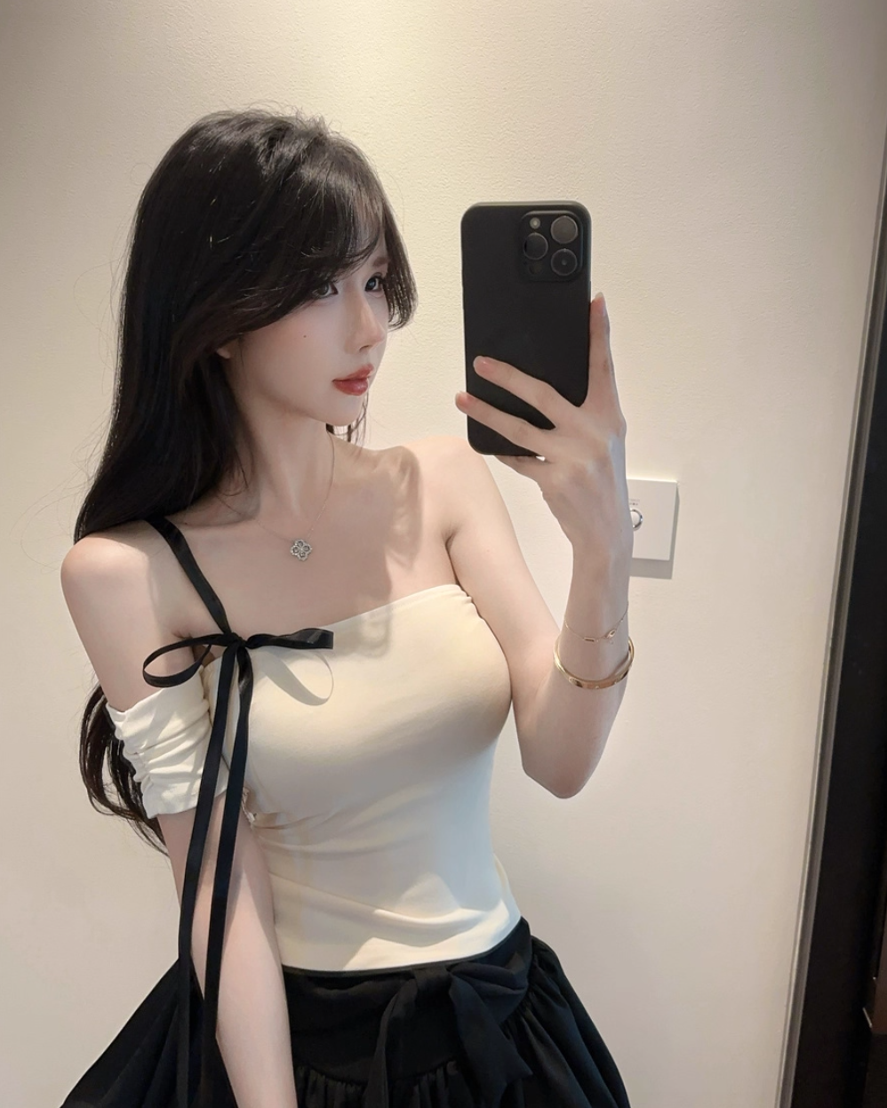 ‘超温柔姐姐’ 一字肩蝴蝶结吊带上衣