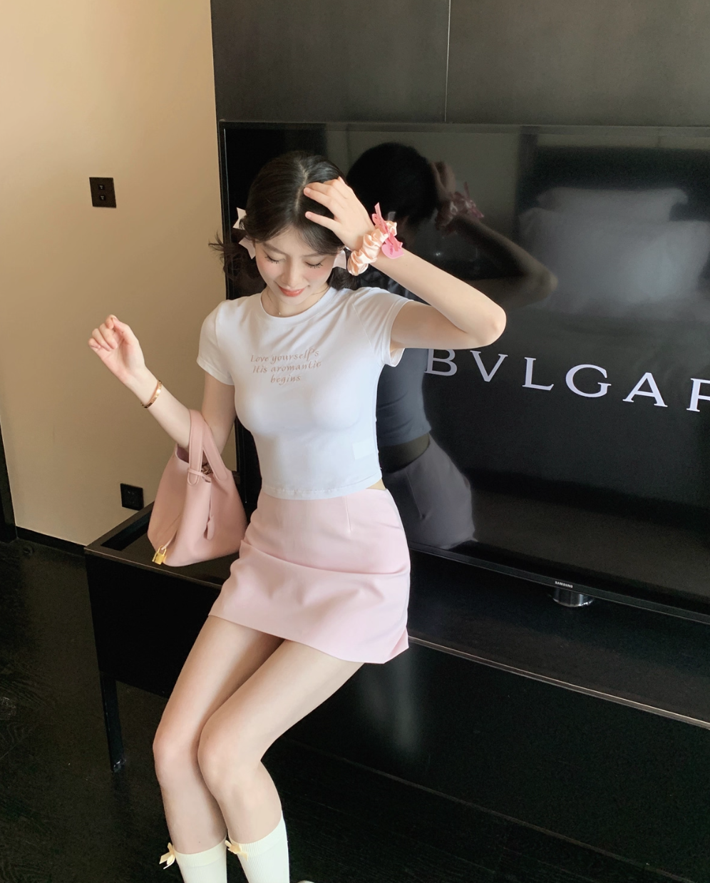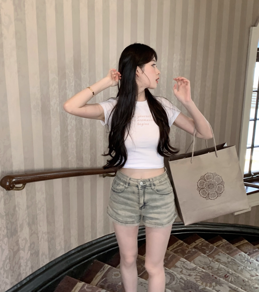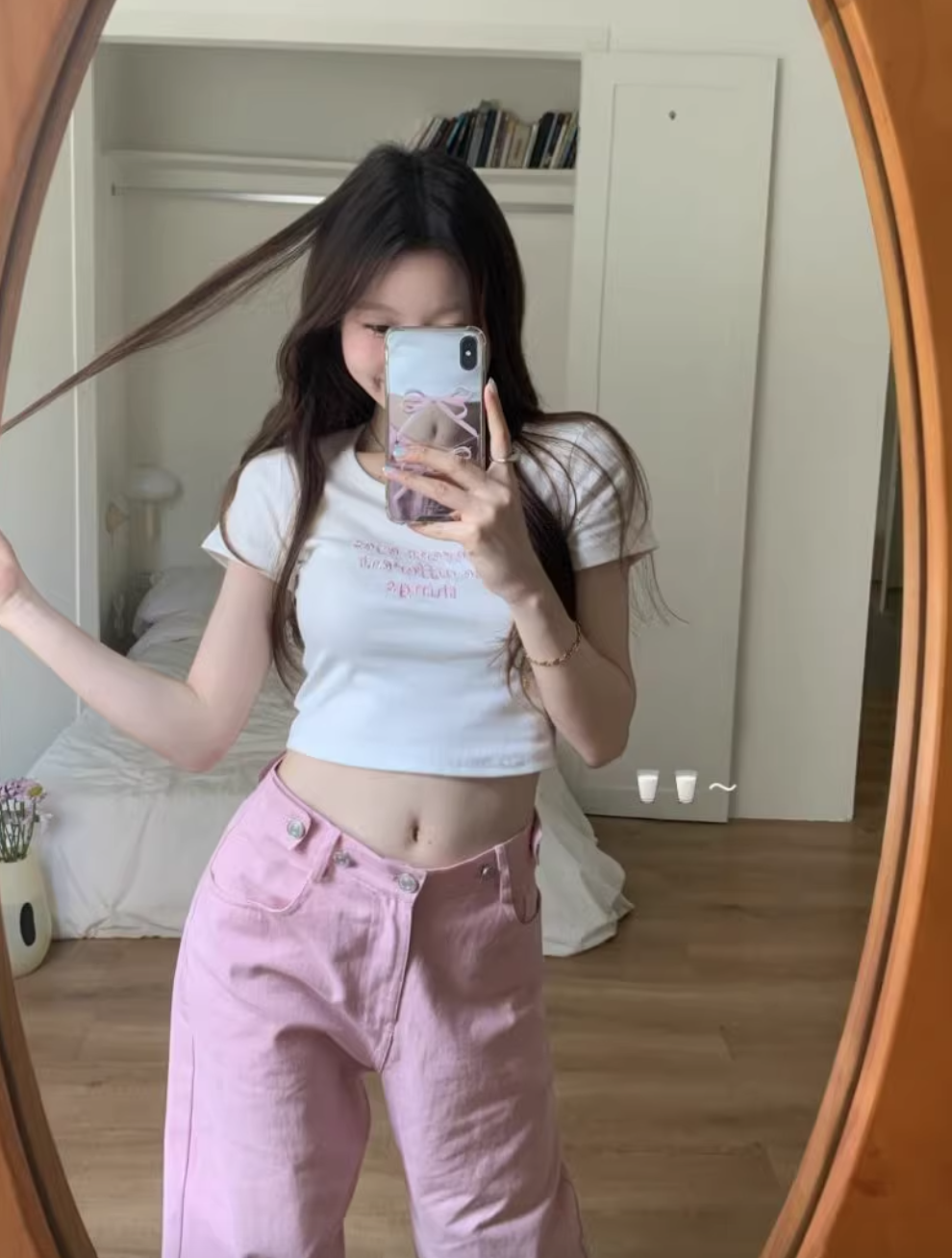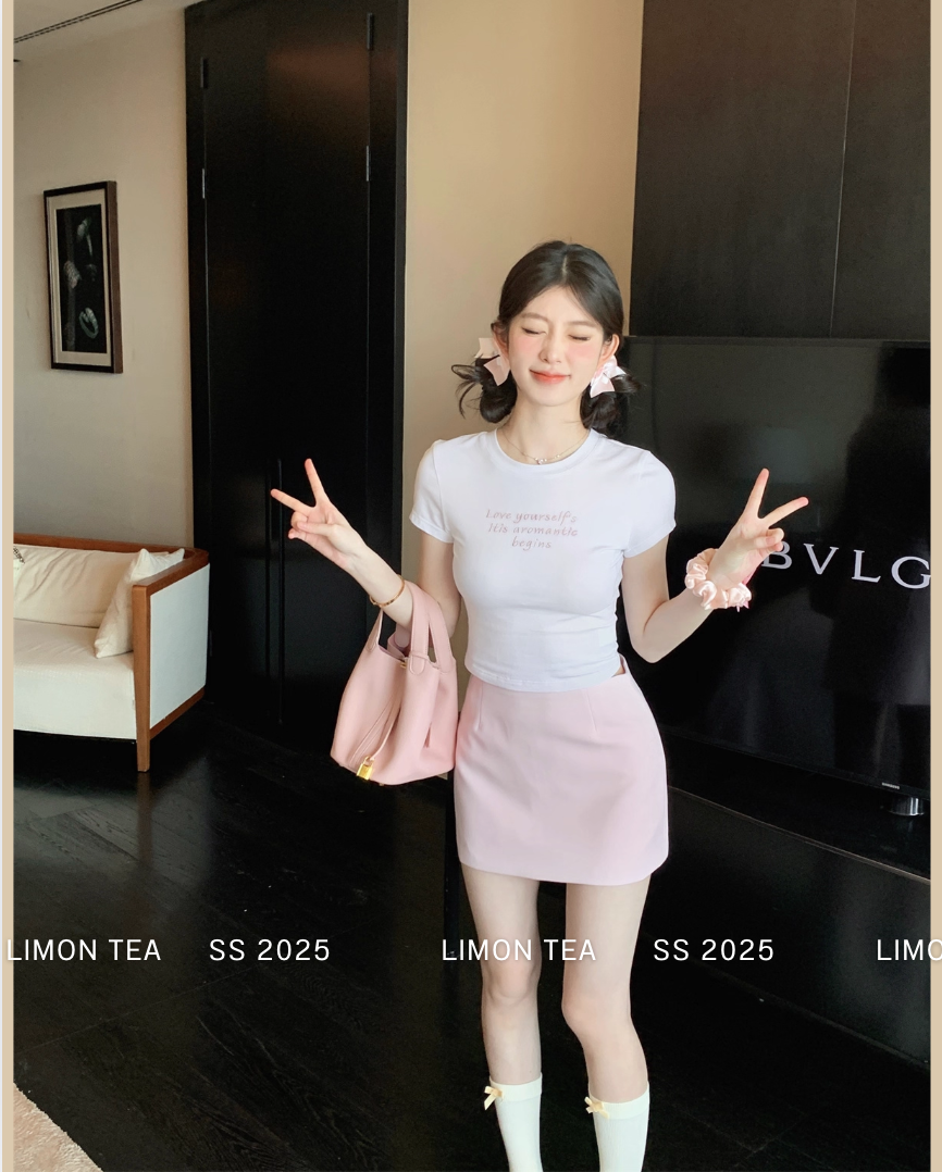‘百搭T恤’ 修身粉色刺绣T恤