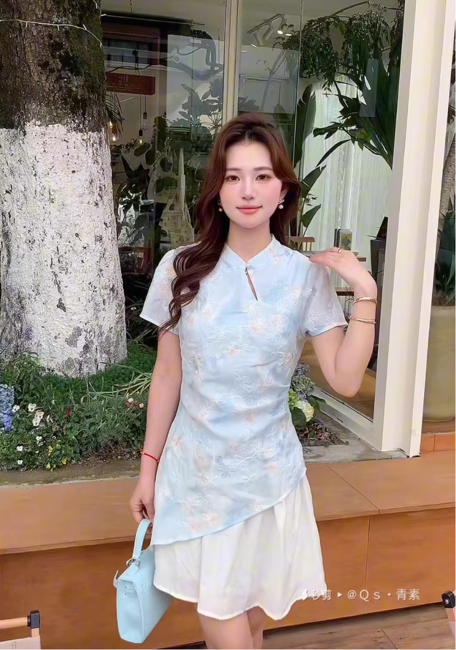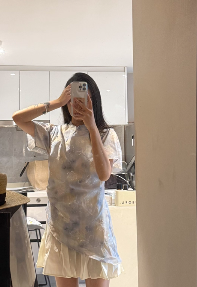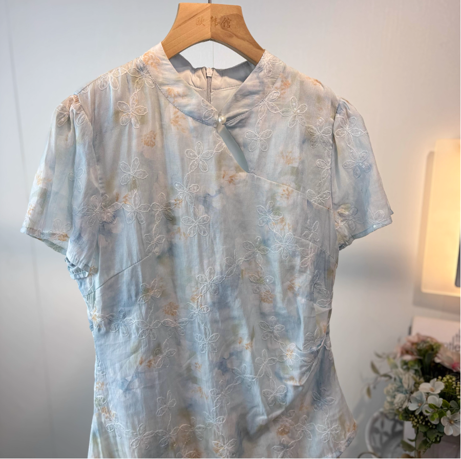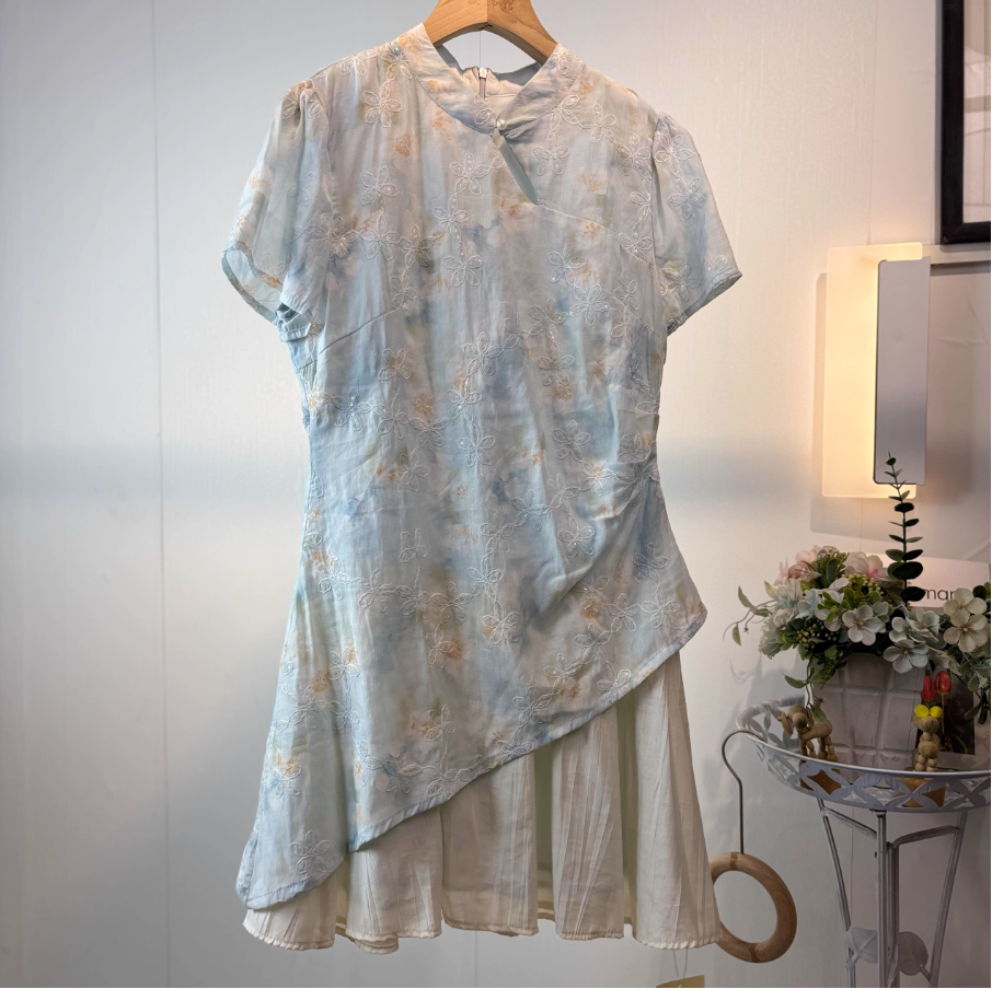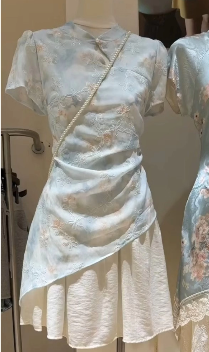 ‘新中式’ 仙气亮片花朵刺绣假两件旗袍