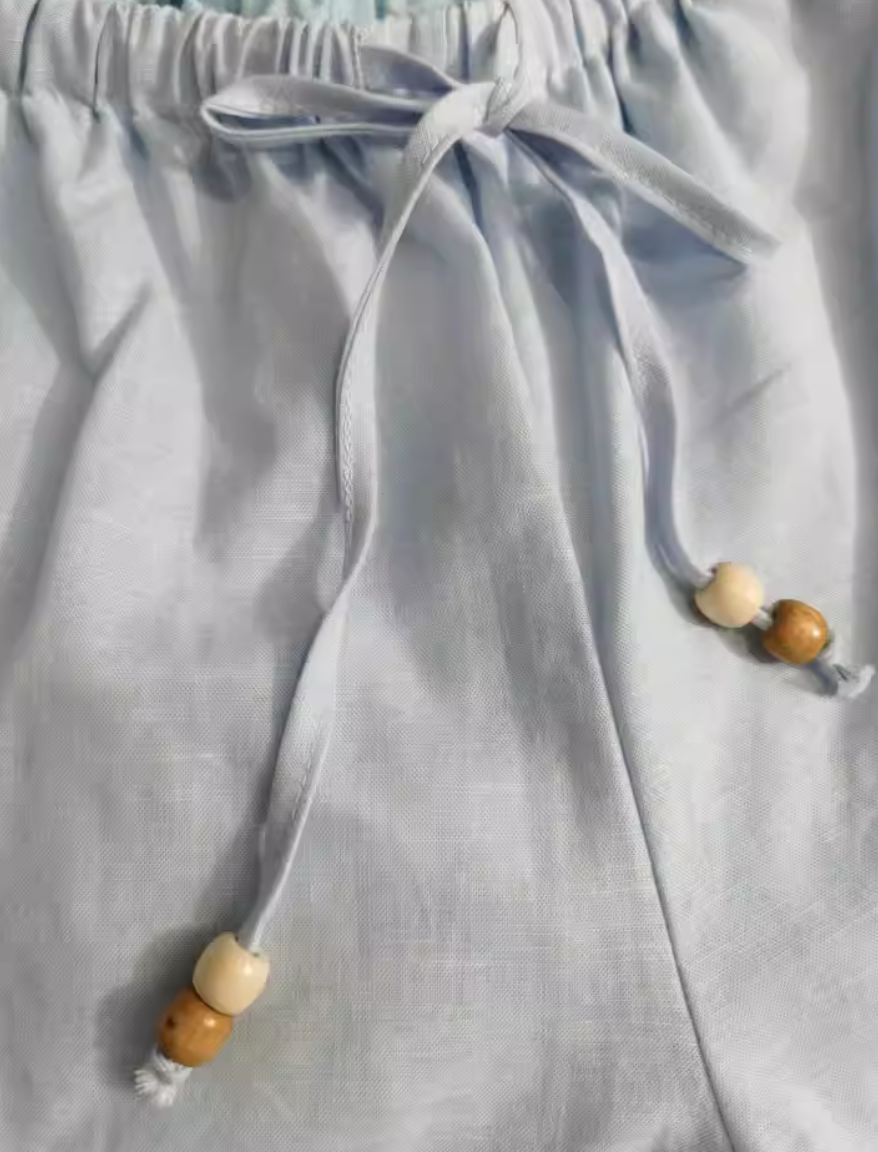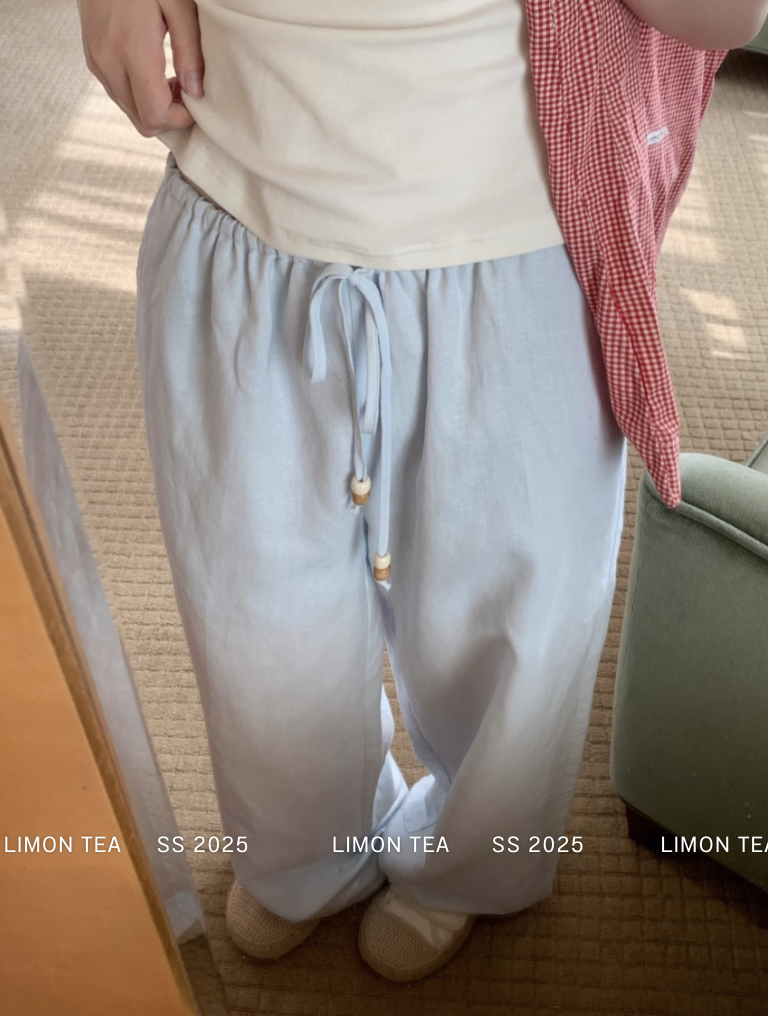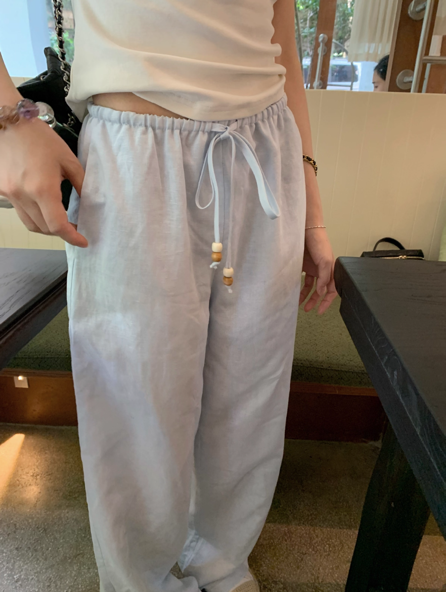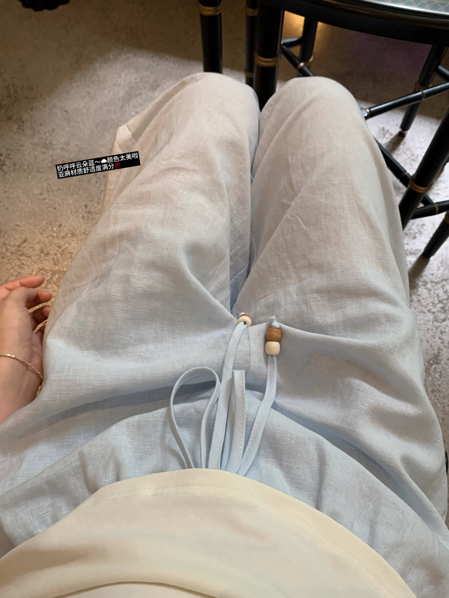 ‘老钱假日’ 木珠抽绳亚麻裤休闲裤